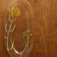 板ガラスをカットし、その上にガラスの粉と糊を混ぜたものを(加賀友禅などで用いられる)糊筒に入れて絞り出して絵付けをしています。その後、電気炉の中にセットし温度をゆっくり上げ、焼成し、徐冷して生地を作ります(フュージング)。絵の表面に少しテクスチュアの残る絵付けの完成です。 |